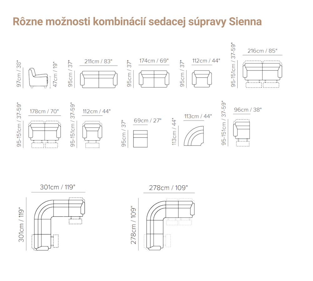 Rôzne možnosti zostáv (sedačky v tvare U, L, rohové, dvojmiestne, trojmiestne, rovné) a najrôznejšie možnosti farieb.